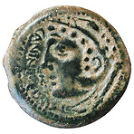 Head of Hercules, covered with lion skin and a club on the left shoulder, to left, External legend
