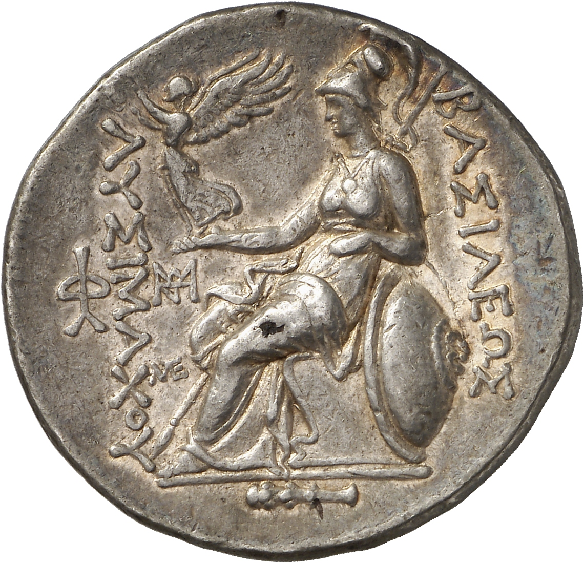 ΒΑΣΙΛΕΩΣ ΛΥΣΙΜΑΧΟΥ Κ: Athena seated on a throne, Nike on outstretched hand; behind, a shield