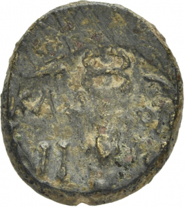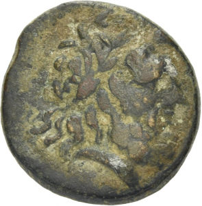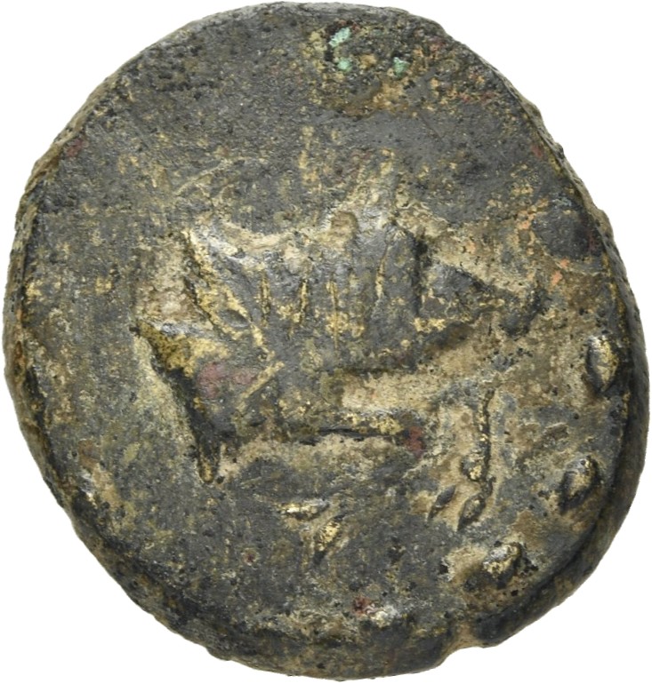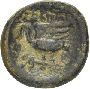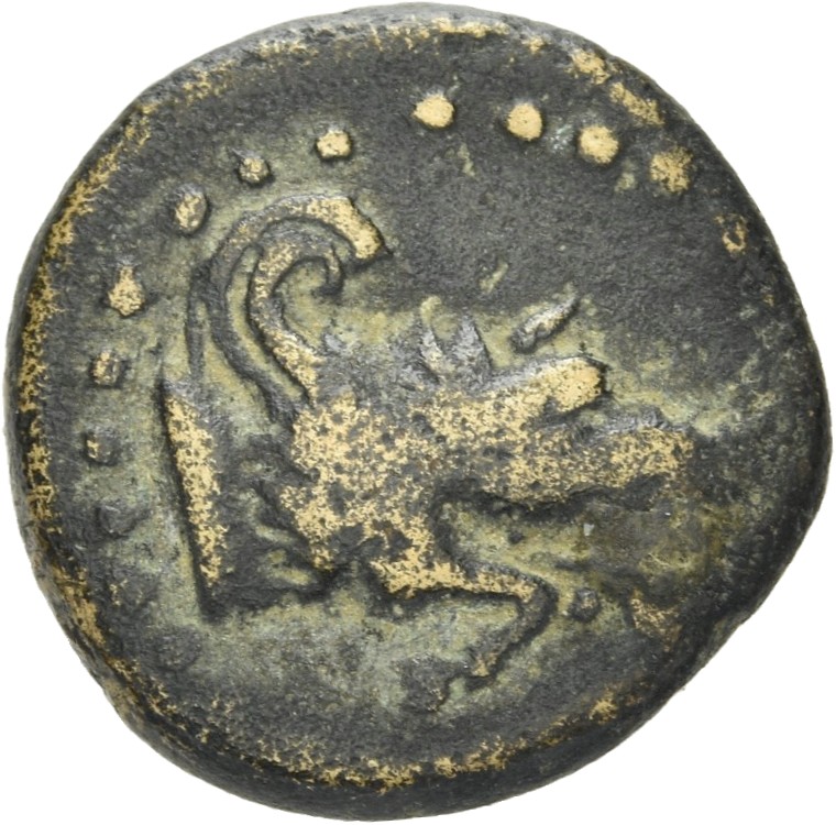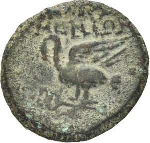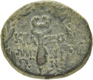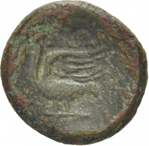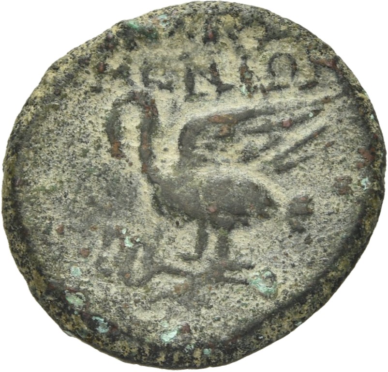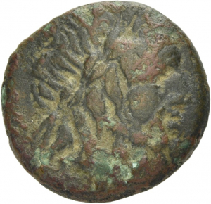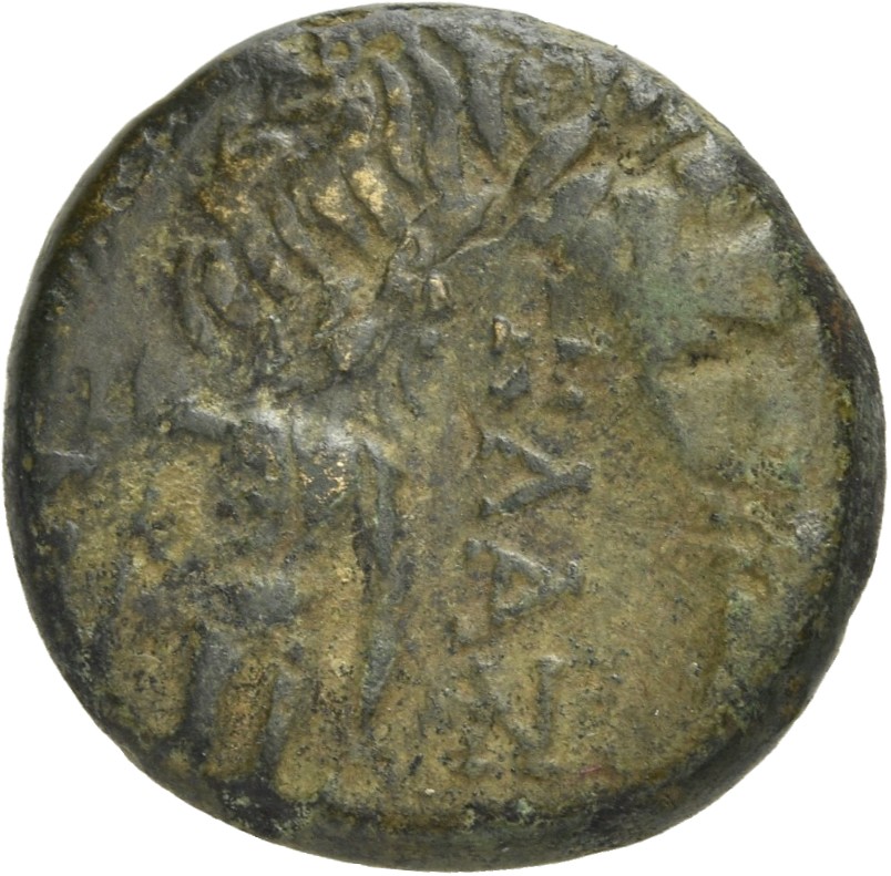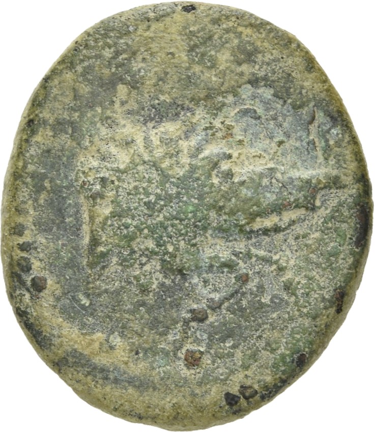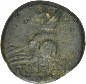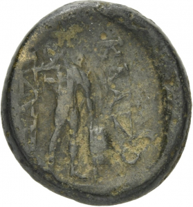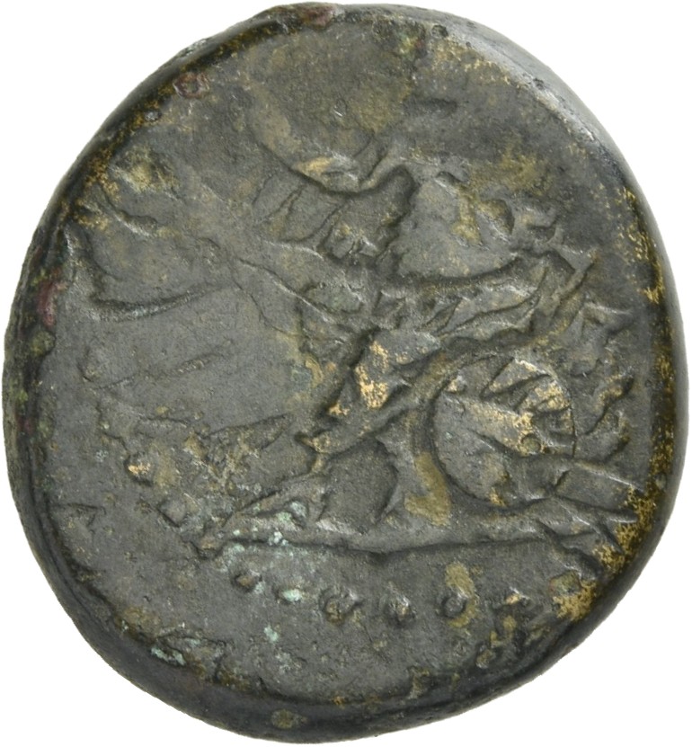 Athena (?) draped, standing facing, holding shiled on the ground and spear