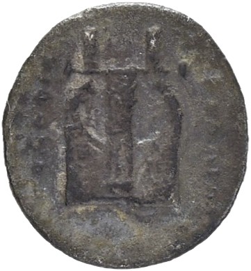 Athena seated on a throne, Nike on outstretched hand; behind, a shield