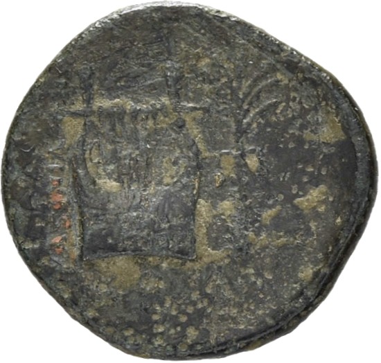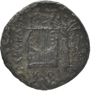 Apollo wearing a laurel wreath and chiton (tunic), holding a palm and a kithara (lyre) placed on the ground; all in a laurel wreath