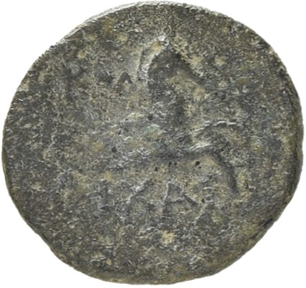 Horseman galloping, wearing a helmet and chlamys, holding a spear