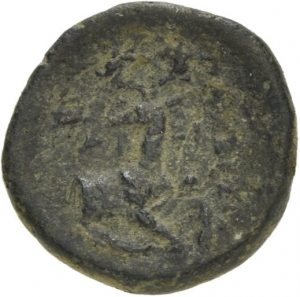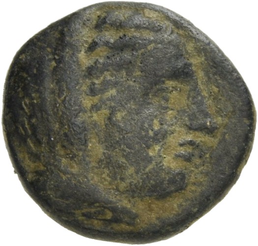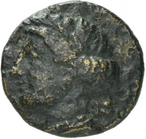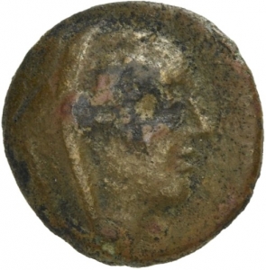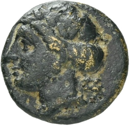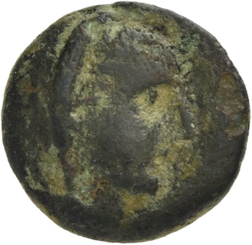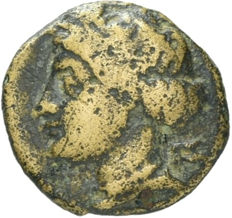 Female head wearing a wreath and turreted crown; behind, astragalos (knucklebone)