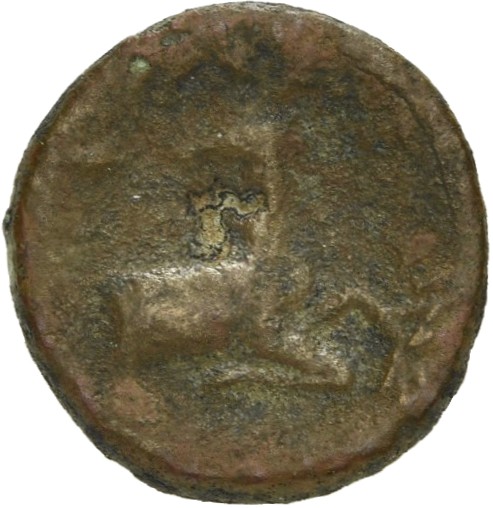 Stag kneeling, head turned back; above, astragalos (knucklebone)