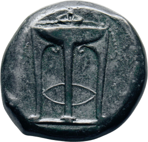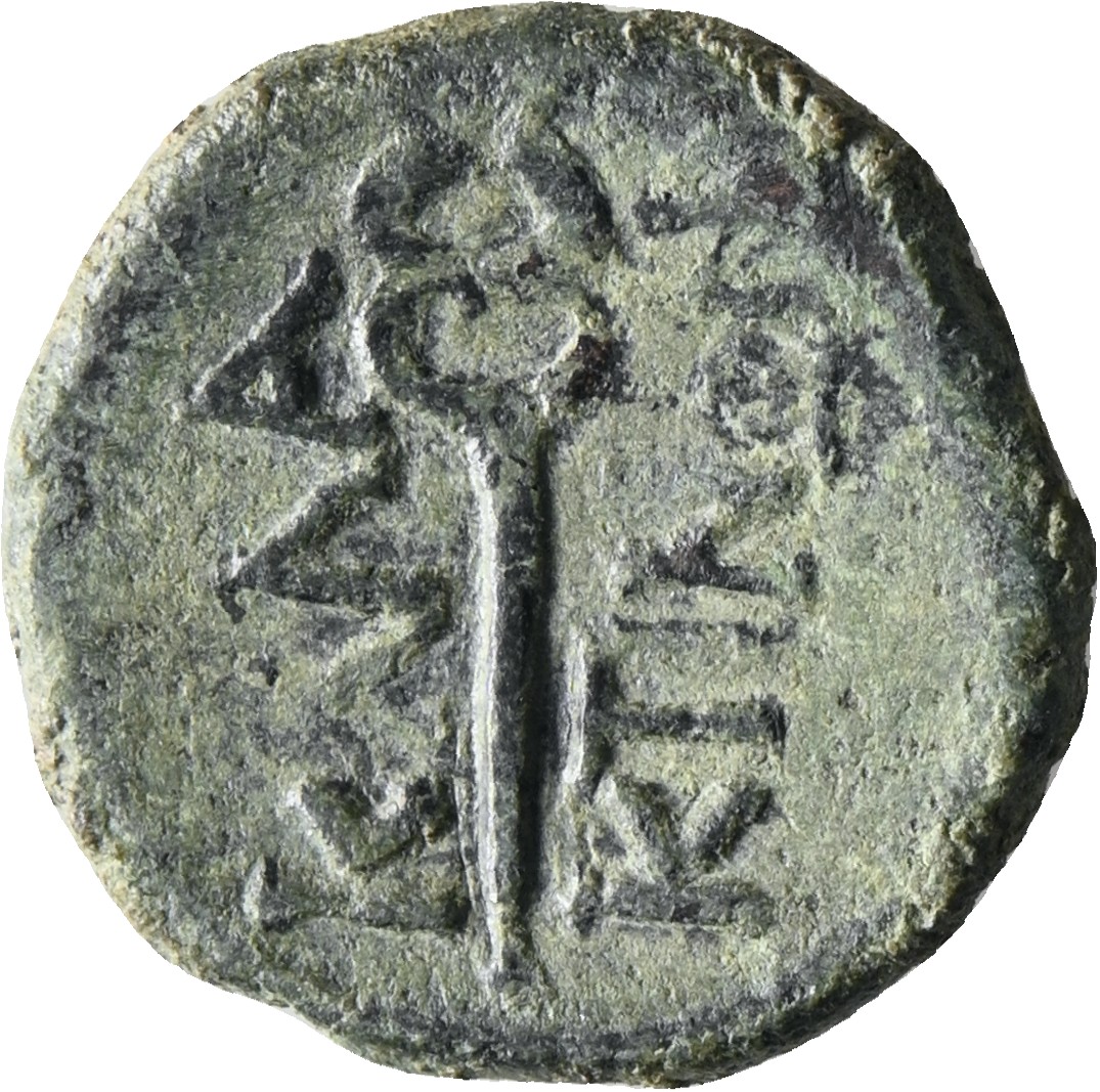 Head of Dionysus wearing an ivy wreath, holding a thyrsus (sceptre surmounted by a pine cone and adorned with ribbons)