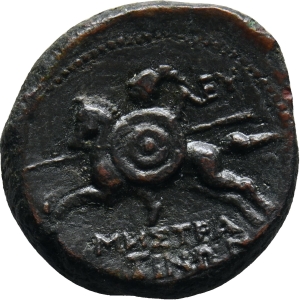 Horseman galloping, wearing a helmet, holding a shield