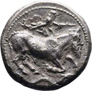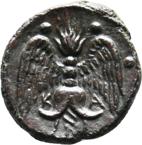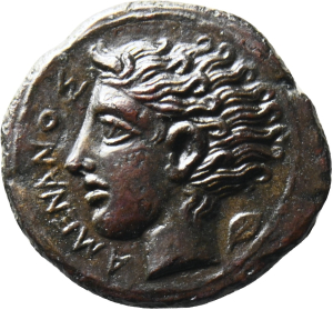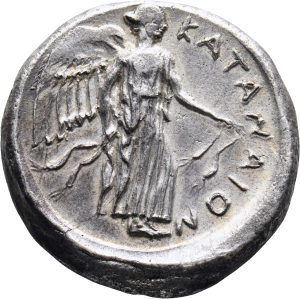 Nike standing, holding a taenia (head band) and aphlaston (curved poop of ship)