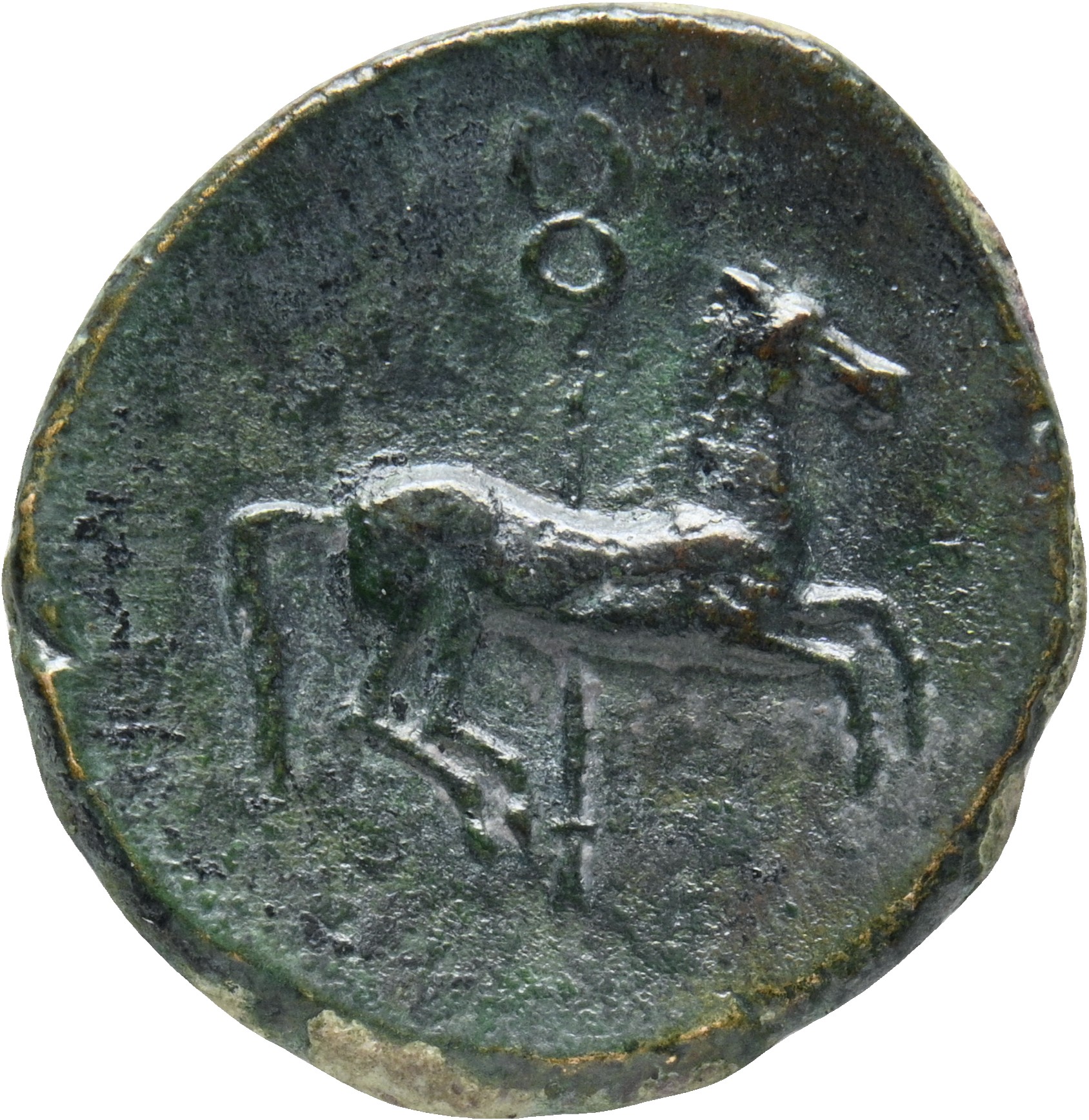 Horse galloping in front of a caduceus