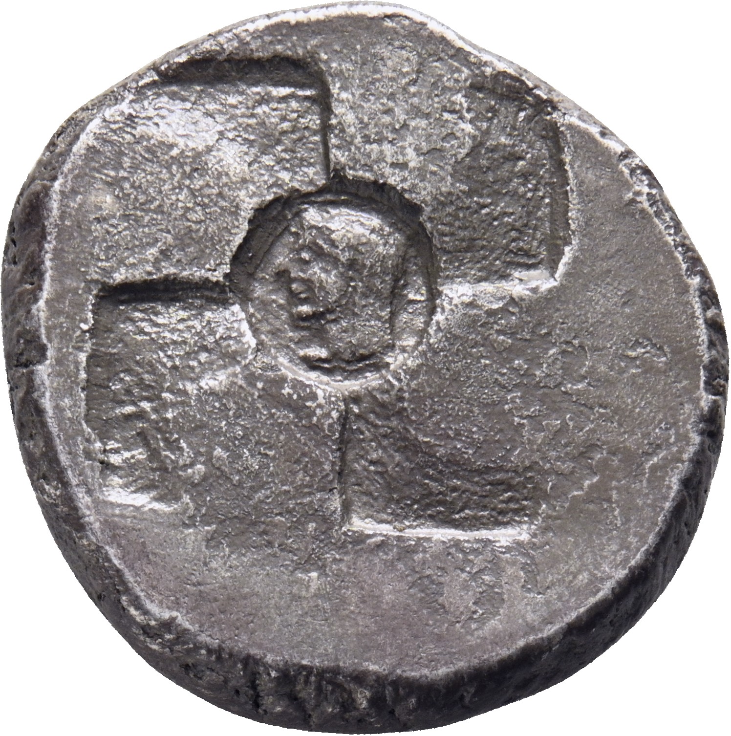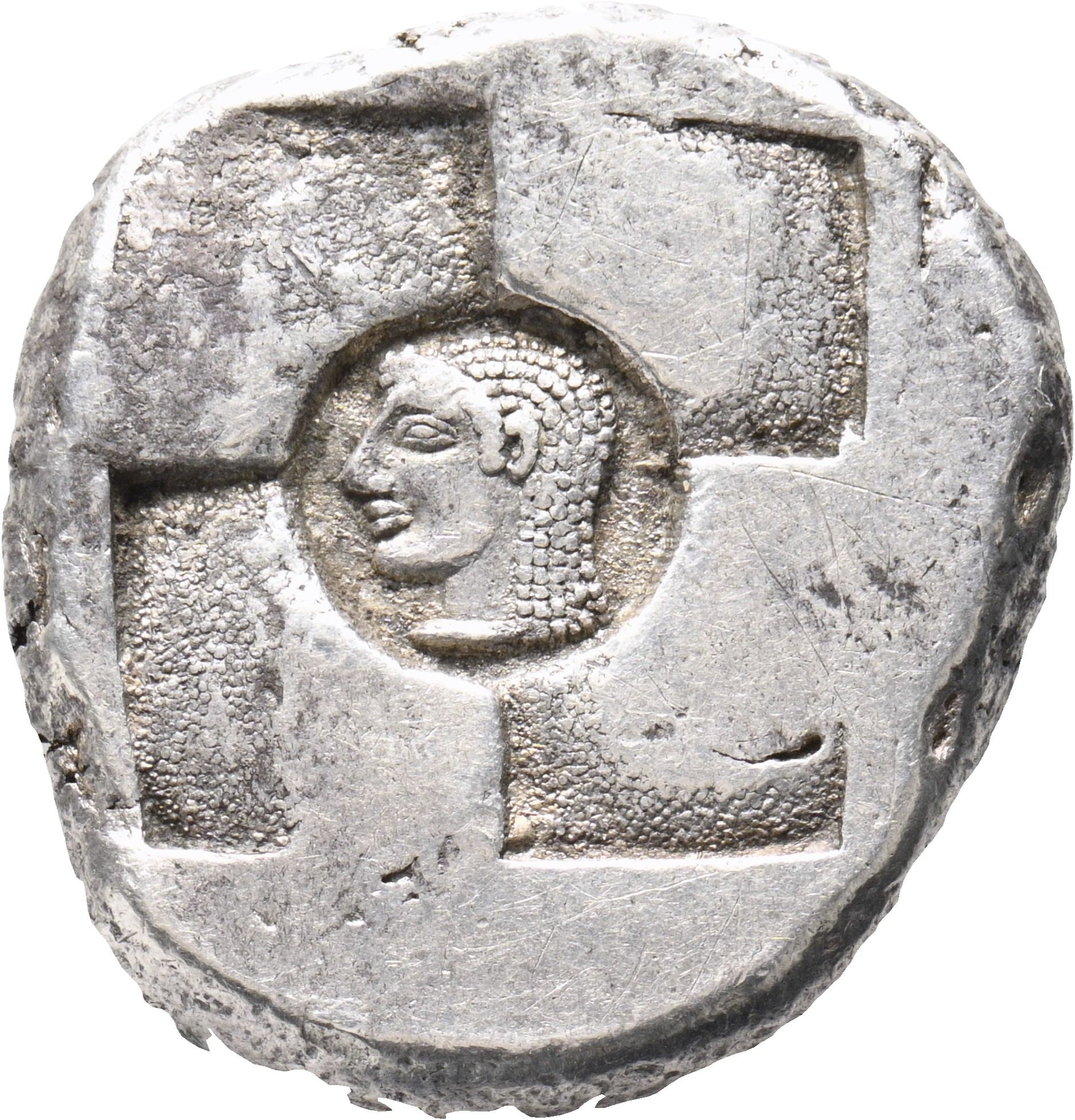 Swastika incuse with a head in the centre