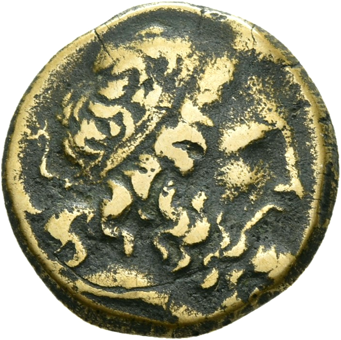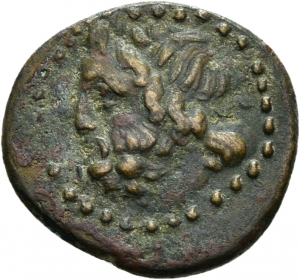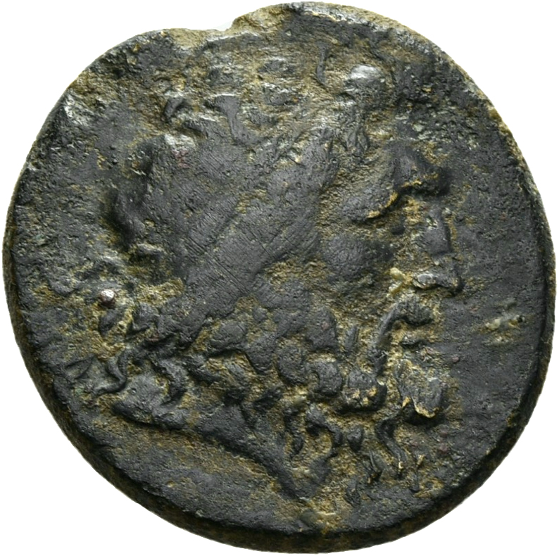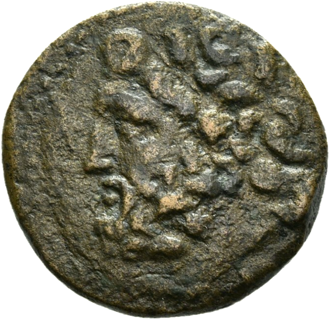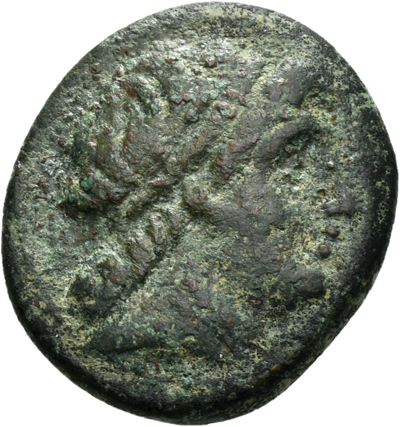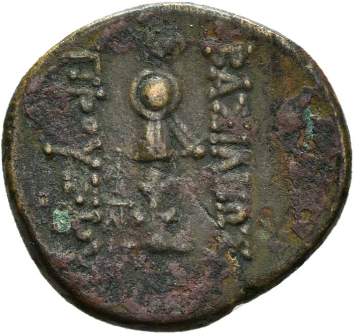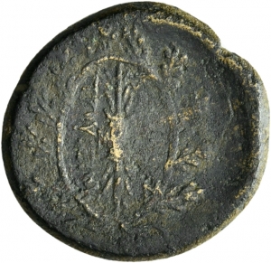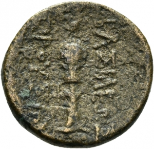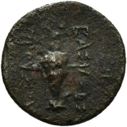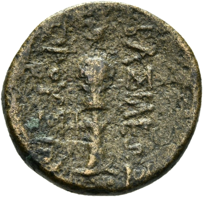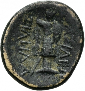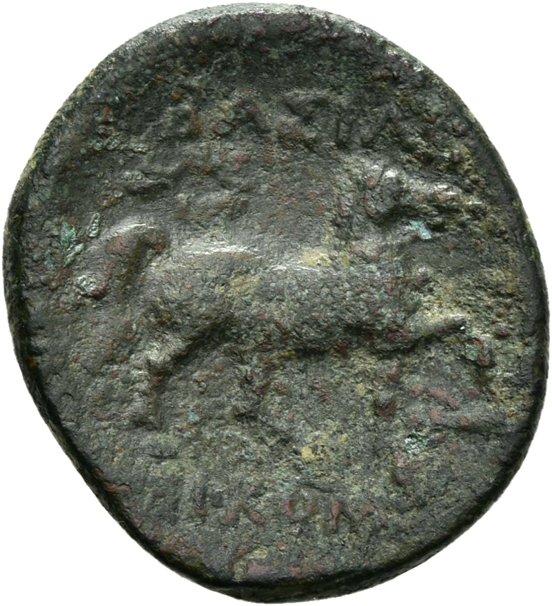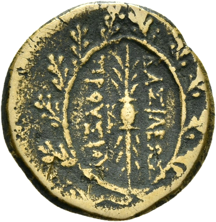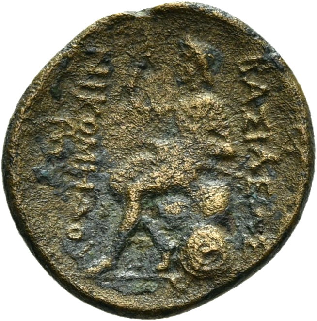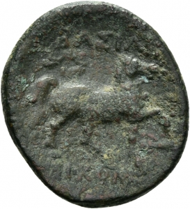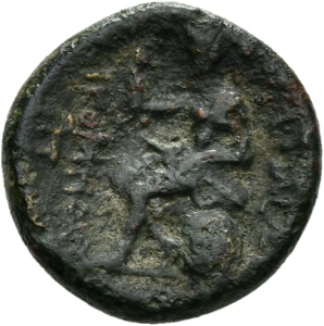 ΒΑΣΙΛΕΩΣ ΝΙΚΟΜΗΔΟΥ: Artémis assise sur un rocher à gauche, vêtue d'une tunique courte, tenant deux lances, une épée dans son fourreau ; au pied du rocher, un bouclier ; en arrière-plan, un arbre