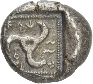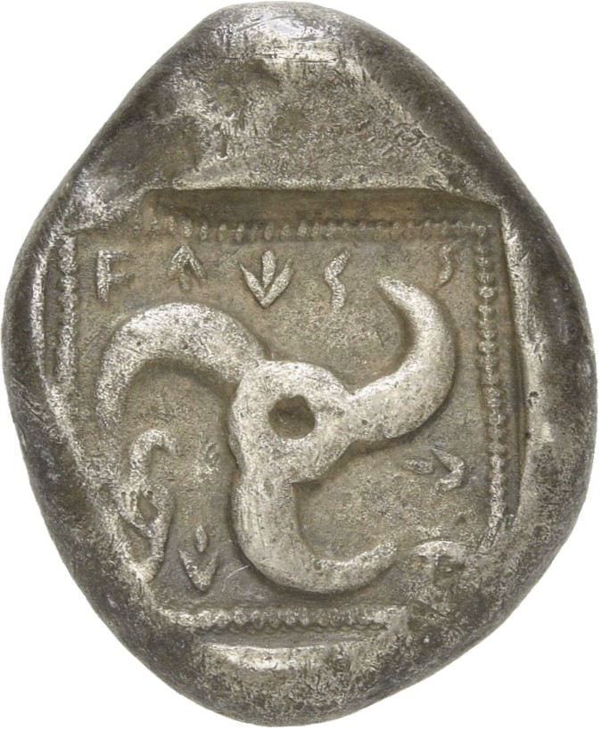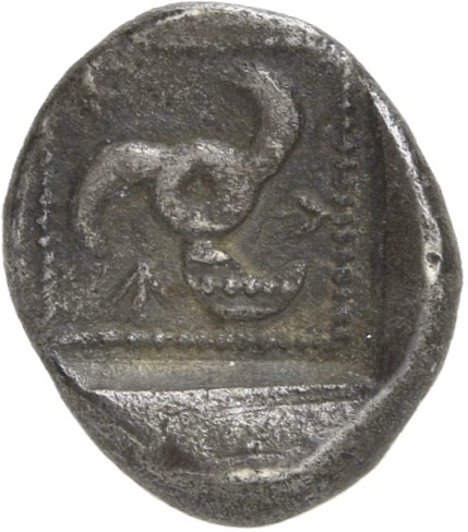 𐊇𐊀𐊜𐊖𐊖𐊁𐊓𐊅𐊅𐊆𐊎𐊆: Deux lions face à face, la tête de face, levant leurs pattes antérieures opposées ; entre eux, un symbole OV ; le tout dans un cercle incus bordé d'un grènetis