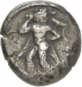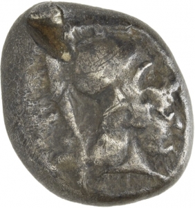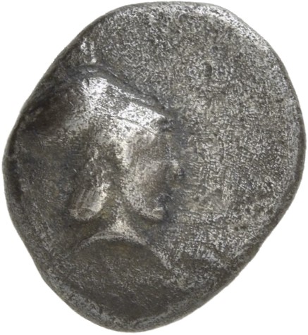 Tête d'Athéna, coiffée d'un casque attique à cimier ; grènetis circulaire
