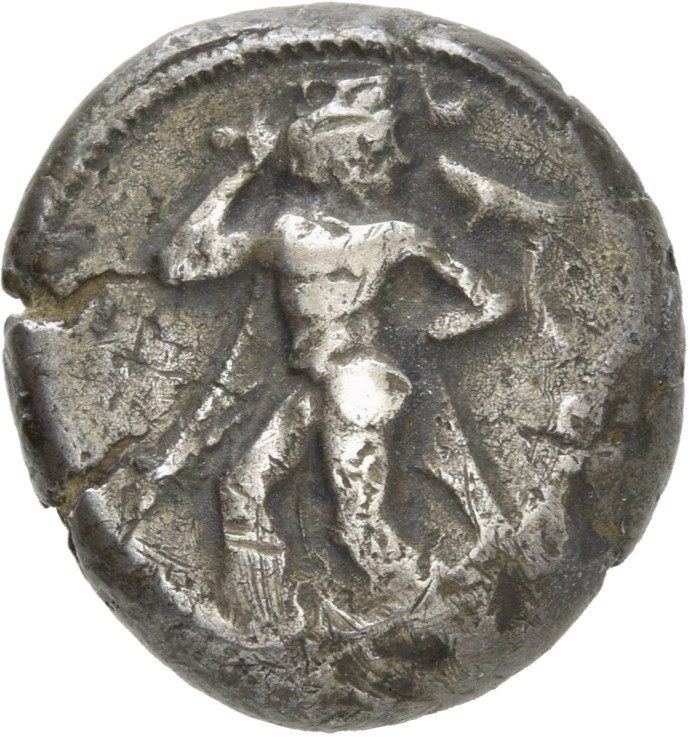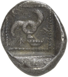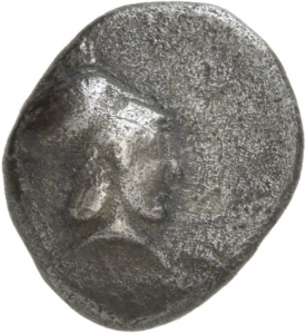 𐊓𐊗𐊗𐊀𐊕𐊀 𐊇𐊜𐊖𐊖𐊁𐊓𐊅𐊅𐊆𐊎𐊆; 𐊓𐊗𐊗𐊀𐊕𐊀 𐊒𐊜𐊖𐊖𐊁𐊓𐊅𐊅𐊆𐊎𐊆; 𐊒𐊜𐊖𐊖𐊁𐊓𐊅𐊅𐊆𐊎𐊆: Tête d'Hermès, coiffée d'un pétase ailé (chapeau rond à larges bords), dans un grènetis circulaire