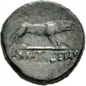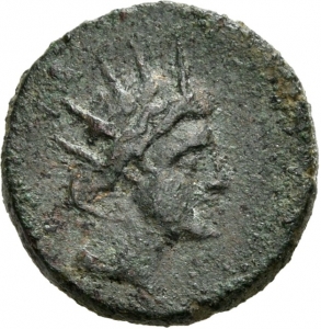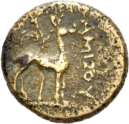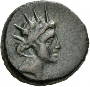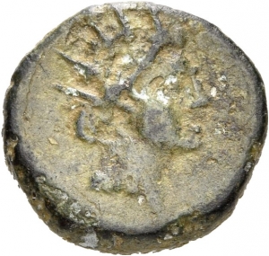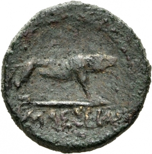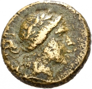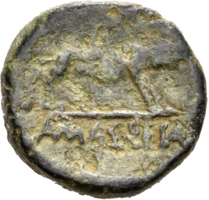 ΑΜΑΣΕΙΑ[Σ]: Persée de face, coiffé d'un casque, vêtu d'un drapé et d'une chlamyde, tenant une harpè (serpe de combat) et la tête de Méduse ; au second plan, le corps allongé de Méduse.