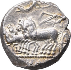 Poséidon assis sur un rocher, tenant un trident et un dauphin