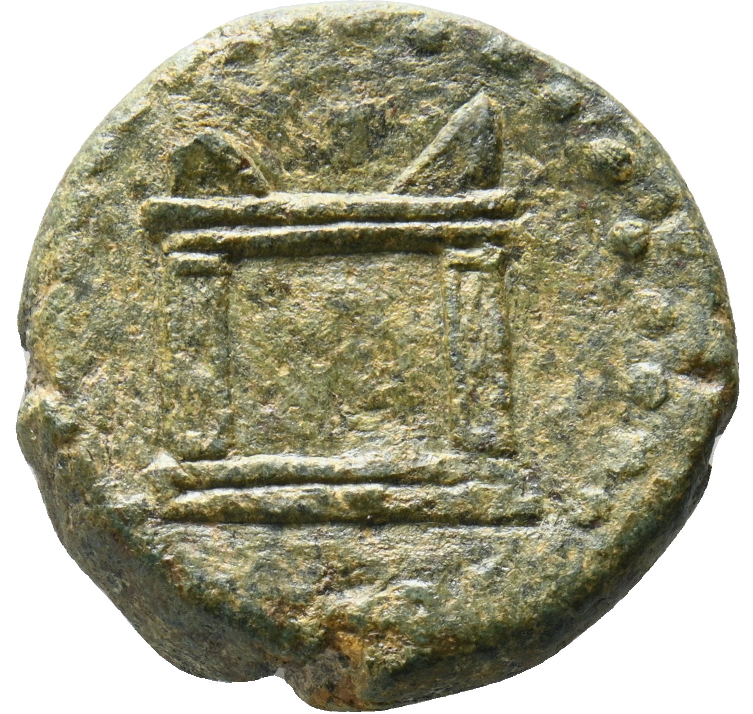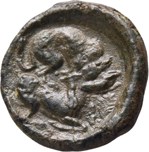 Bélier debout ; au-dessous, une tête janiforme.