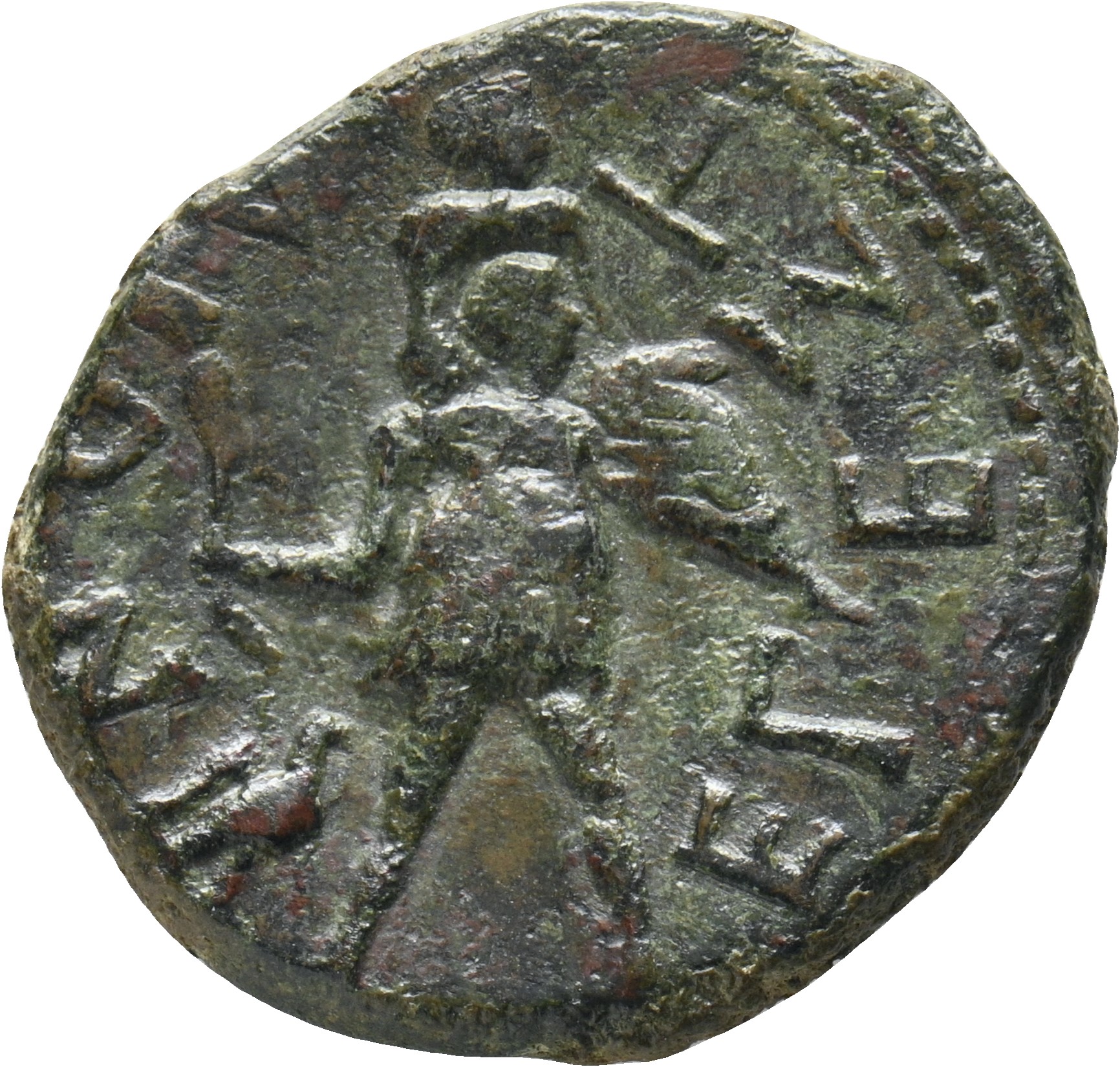 Aigiste debout, un pied sur des rochers, coiffé d'un pileus (bonnet), tenant une lance