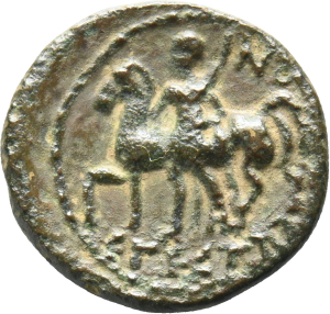 Guerrier (Dioscure ?) debout, tenant une lance et un cheval