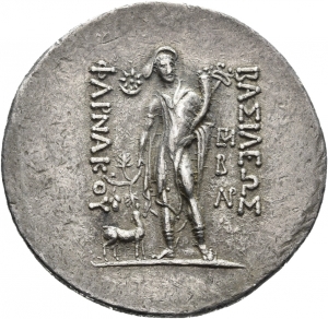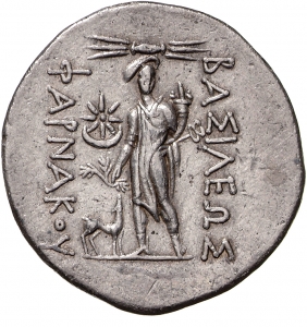 ΒΑΣΙΛΕΩΣ ΦΑΡΝΑΚΟΥ: Hermes-Mithras facing, draped, wearing a miter, stretching a vine to a fawn and holding a cornucopia and a caduceus; in the upper field, a star on a crescent