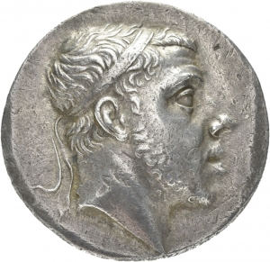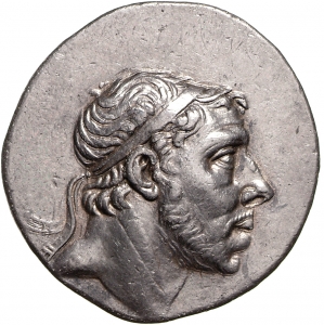 Bust of Tigranes II draped, wearing tiara decorated with a star between two eagles and tied with a diadem; all with bead and reel border