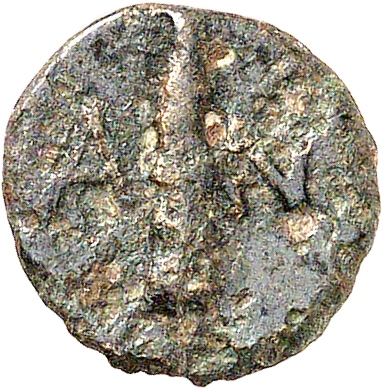 Head of Poseidon wearing a laurel wreath; at shoulder, trident