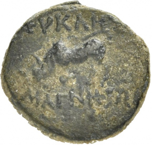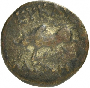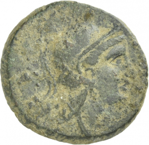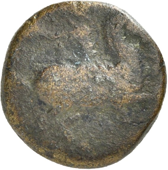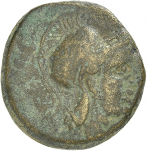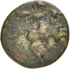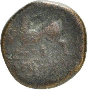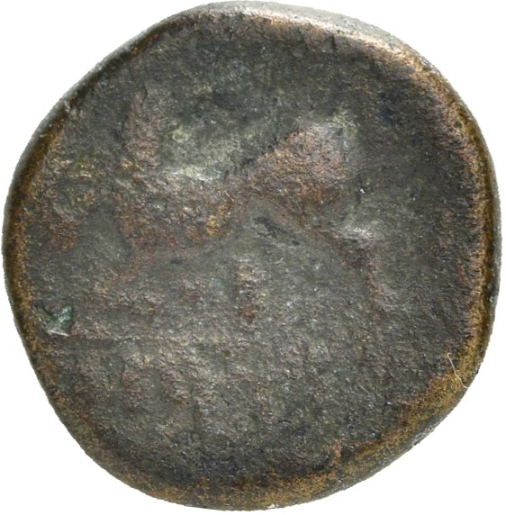 Bust of Artemis with a bun and a stephane (ribbon), draped; in the left field, bow and quiver