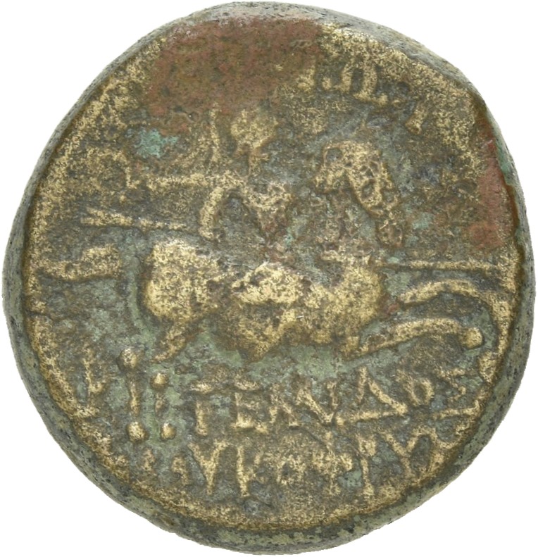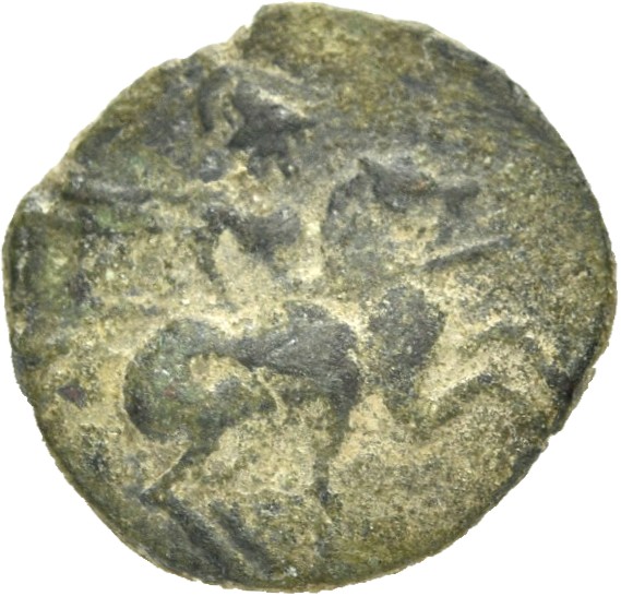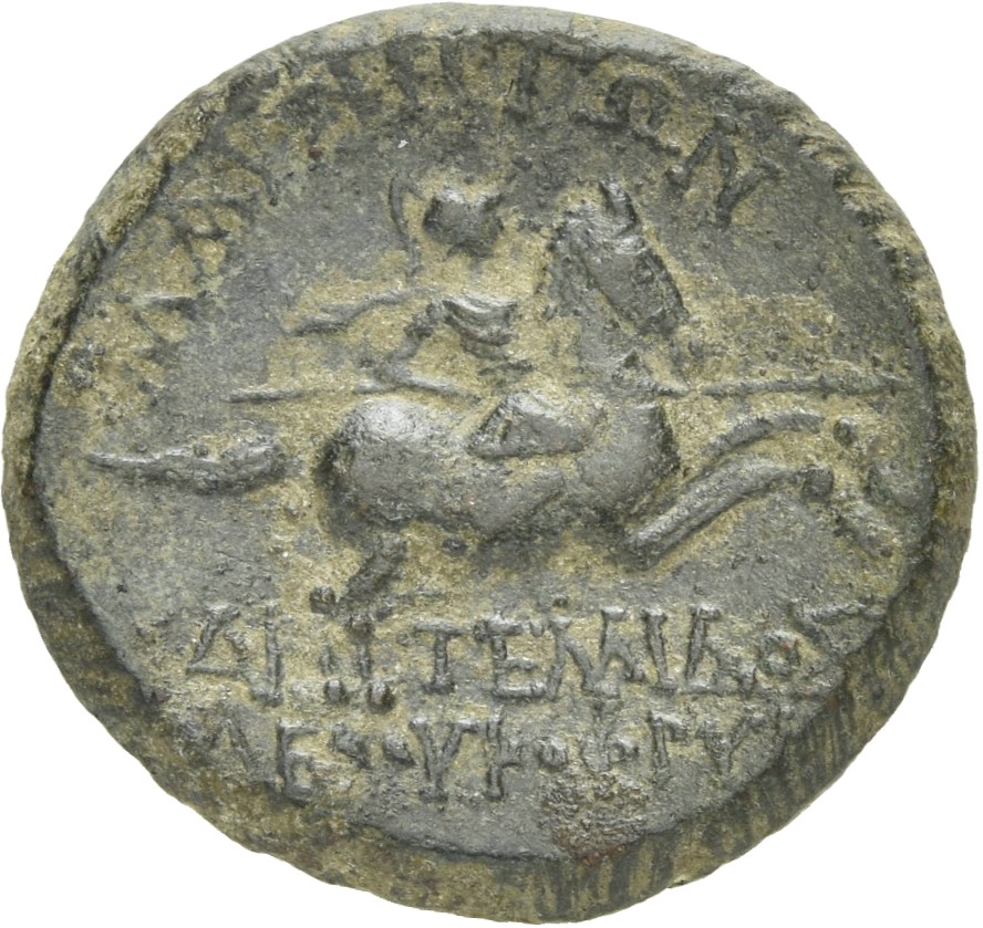 Horseman galloping wearing a helmet and wearing a chlamys (cloak) and a breastplate, holding a spear