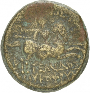 Horseman galloping, wearing a helmet, chlamys and breastplate, holding a spear