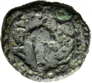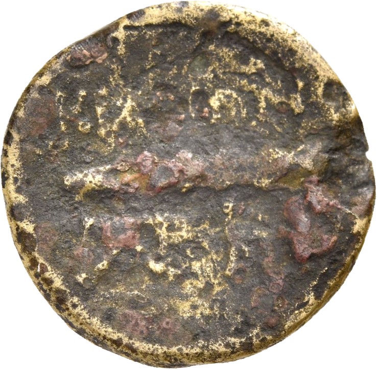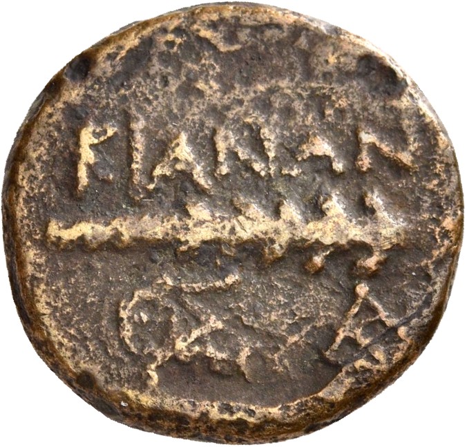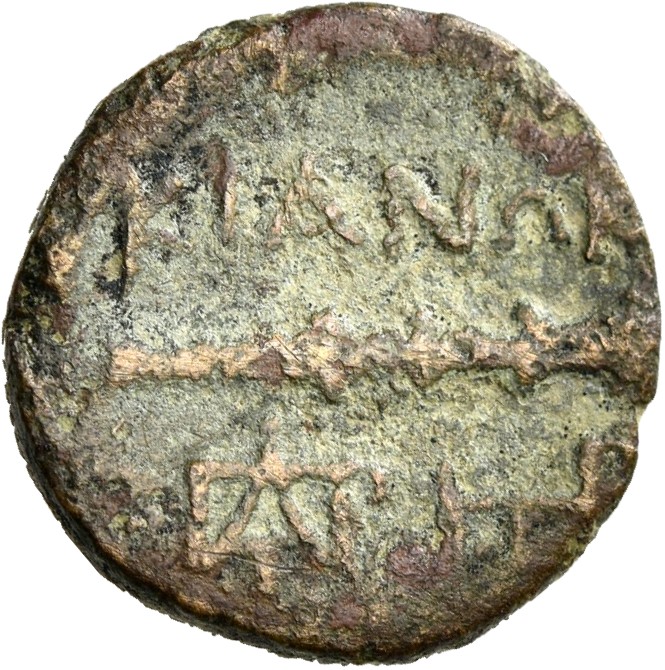 ΔΙΑΣ: Cista mystica (ritual basket) surmounted by a thyrsus (sceptre surmounted by a pine cone and decorated with bands)
