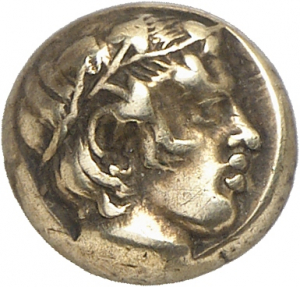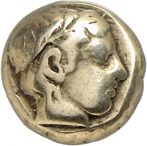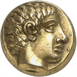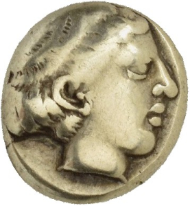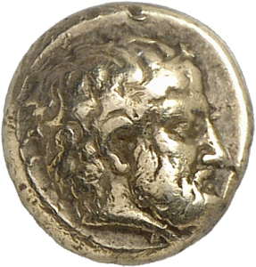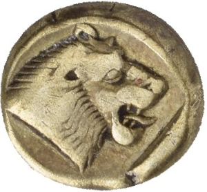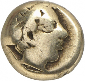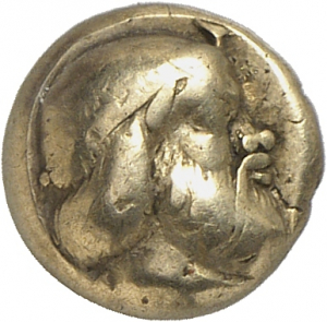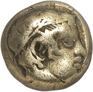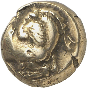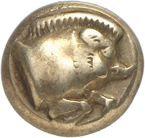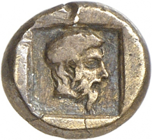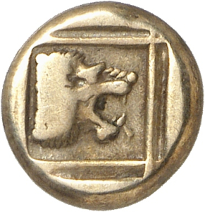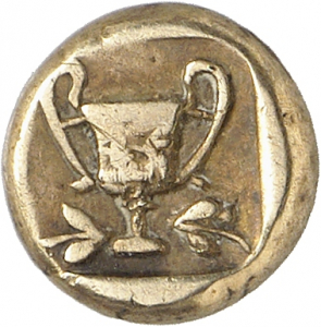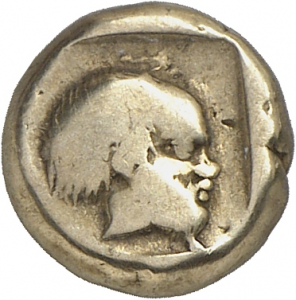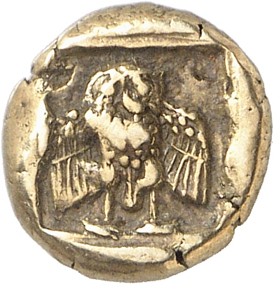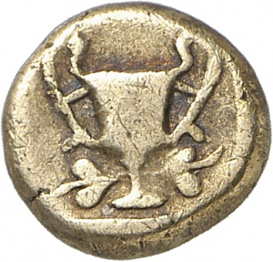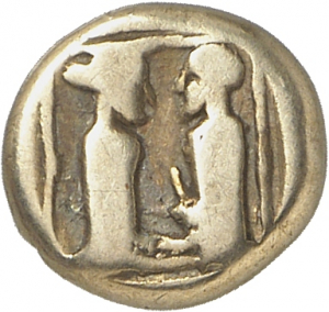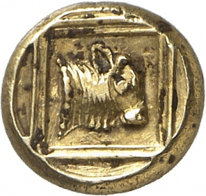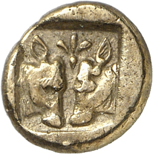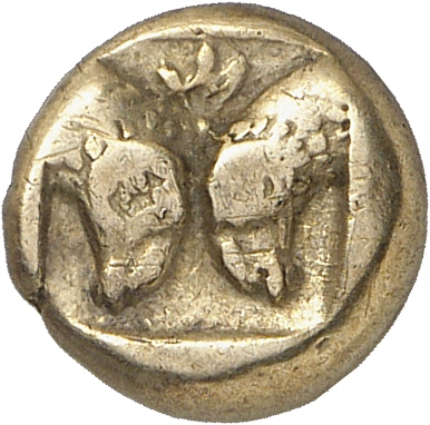 Ψ: Two calves' heads facing each other; in the upper field, palmette; all in an incuse square