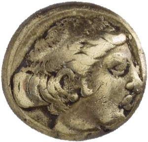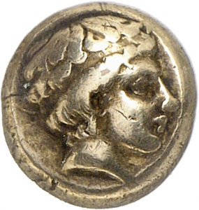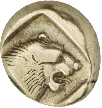 ΛΕ: Two calves' heads facing each other; all in an incuse square