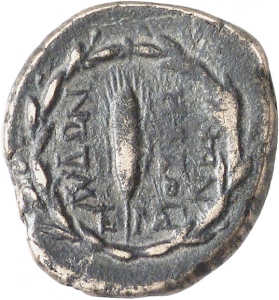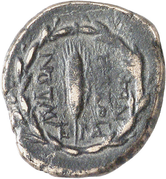 Gorytos (bow case) decorated with an aplustre and containing a bow, between two intertwined snakes; to side, grain-stalks